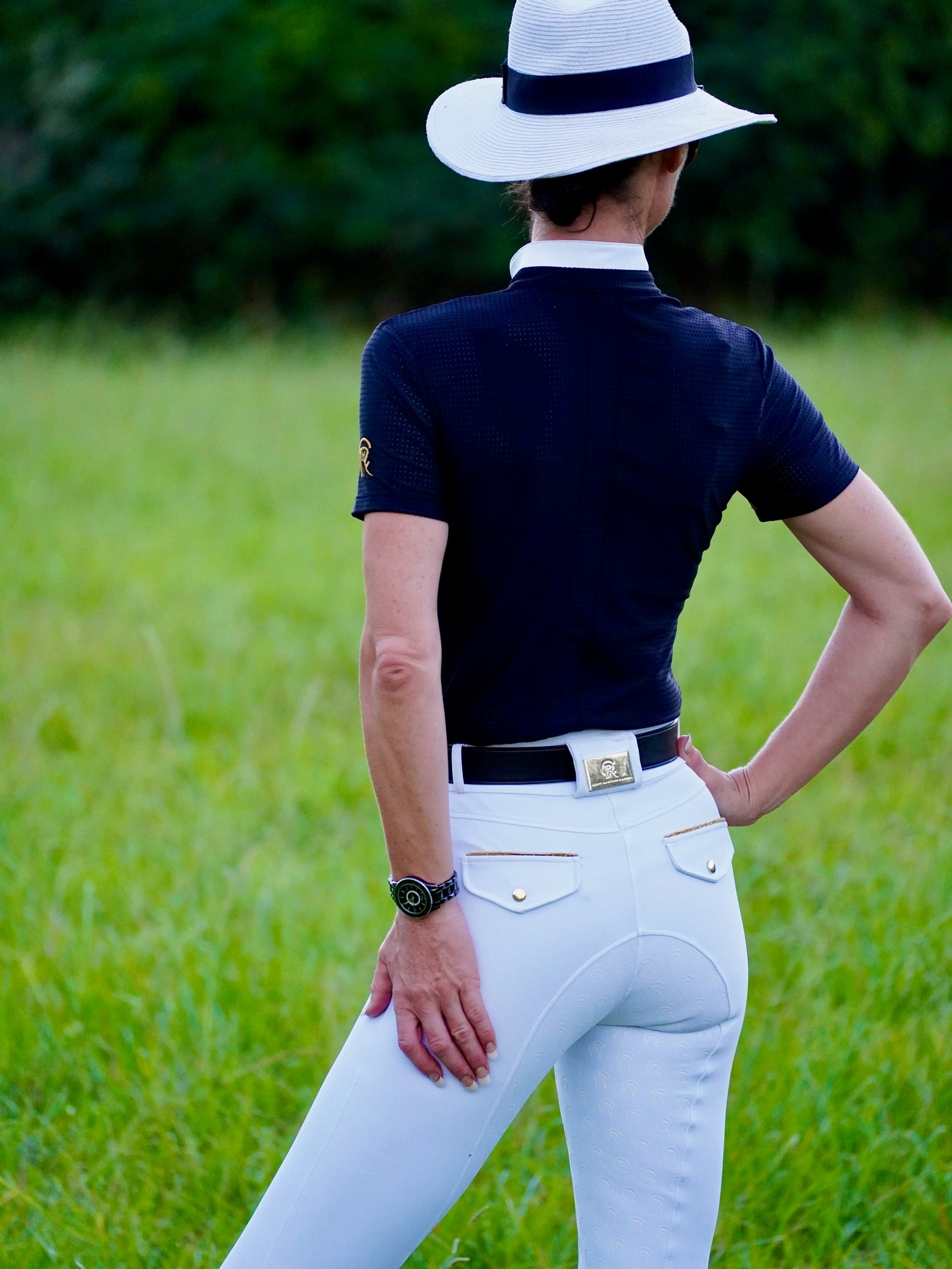 The zip, button and structured collar design make this top incredibly versatile. Zip it up for a polished competition look, or wear it unzipped for a more relaxed look while training or out on the trails. It also works well as a base layer under a show jacket, allowing airflow without adding bulk.